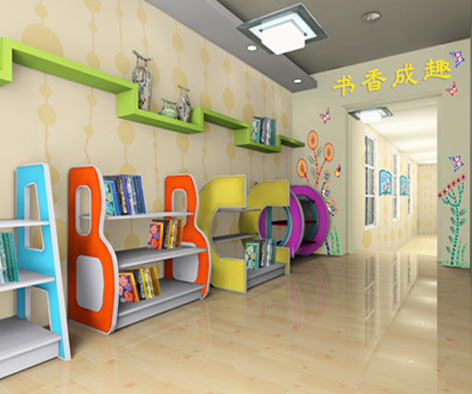 设计说明: 读书角以“博观约取、知源获智”为主题进行创意设计,展示读书对于人自身发展的重要性,开辟成人阅读区和儿童阅读区,营造不同的文化氛围,让师生感受书香成趣之美。