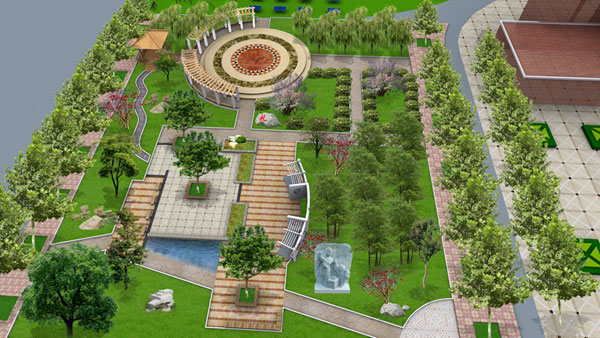 设计说明: 此处环境设计突显学校的“德育”特色,将德育与生态融为一炉,旨在构建一个存在于学生学习、生活、活动环境中的文明之园,存在于学生心灵中的道德之园。设置艺术廊架,穿插休闲道路,木椅、绿色植物、花草、灵动的动物雕塑、随意放置的奇石等,整个布局力求错落有致、相映成趣。整个园子的设计注重体现人本思想,培养学生的美好品德及热爱生活、热爱大自然的情怀。