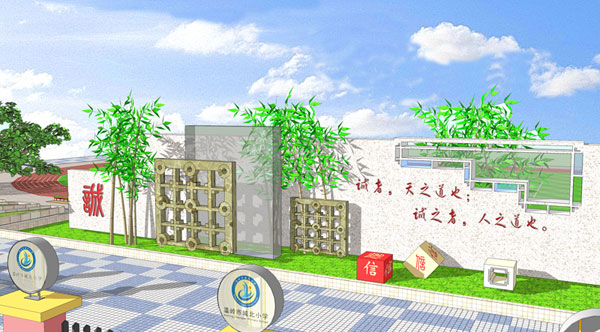 设计说明: 此文化墙主要采用透景法进行设计,整体呈现文化美和艺术。在镂空的墙面上镌刻“诚者,天之道也;诚之者,人之道也。”由此让墙体文化展现诚信文化的重要性,启迪学生重视以诚修身、以信立世,让每个学生以诚信为先,与人交往要以诚信相待,求学之路要以诚实为本。