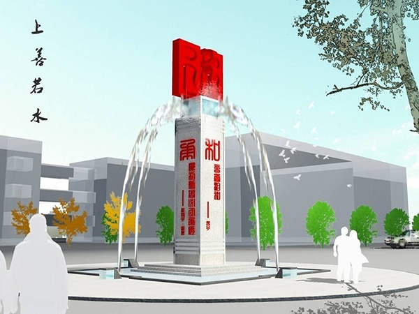 在广场的中心设置一面主题雕塑,暂命名为“上善若水”,初步构想是在广场中心位置开辟一方水池,水池中央立一块高约九米的大理石质文化柱,其南北东西四面分别用繁方篆字体镌刻象征水性的“和、智、刚、柔”四个大字,并相应附置经典阐释字样,顶部为托起的精巧镂空的篆体“水”字,底部水池四面分别配置地灯喷泉,泉水喷发时可直击景柱,夜晚观之,彩灯四射,水雾弥漫,如梦如幻。主雕既是学校发展的定海神针,又是引领学校发展的不灭之魂。整个设计,品物相融,景情合一。(江苏省涟水中学)