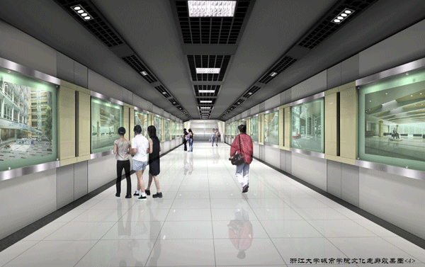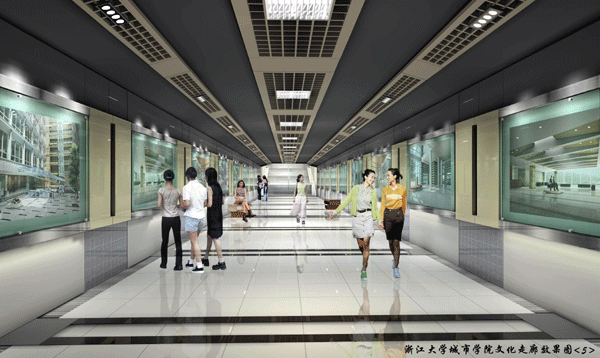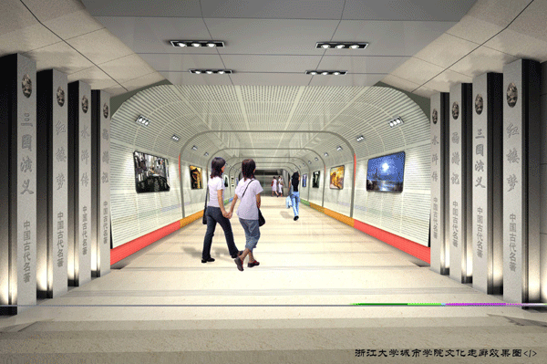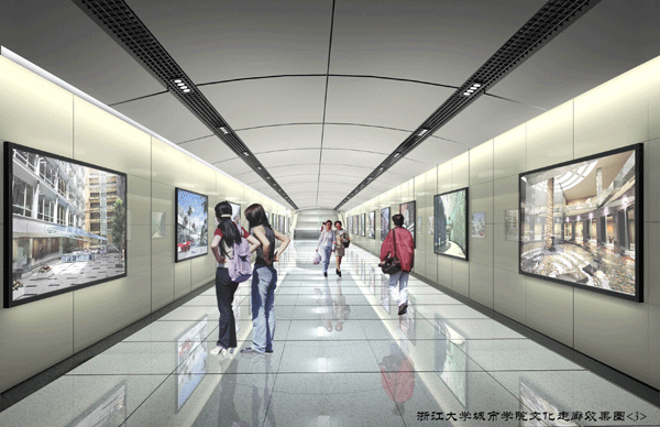 浙江大学城市学院文化长廊(南北校园地下通道)内部装饰设计的理念目标:现代、简洁。在设计中力求达到功能性和艺术性的统一,重视审美与个性追求的统一,使建成后的文化长廊成为校园精神文化的一部分。设计方案中注重空间上的整体和谐,功能齐备、环境优雅。设计方案中采用了玻化砖和香槟色铝塑板相衬作为装饰主调,创造出一个现代、简洁、人文气息浓厚的文化长廊。对川流不息的长廊地面采用玻化砖为主的材料,它明快的色彩跟设计效果贯穿统一,成为设计效果的有机组成部分;为了突显学院的青春活力、文化气息,在文化长廊两侧设计了艺术展示窗口,艺术展示窗口用材选择香槟色铝塑板为主,与整个设计效果相协调,具有浓厚的人情味;顶部用材选用浅灰色防水涂料、香槟色格栅和香槟色铝塑板来装饰;整个艺术长廊,在顶部中间有一排3X30W格栅灯,两边装射灯,通过简洁的造型,明亮的灯光,营造出一个新颖现代、明快有序的空间,使整个文化长廊让人有一种亲和感!通过对文化长廊的地面、墙面、吊顶和灯具的设计,使文化走廊空间更为宽敞、内容丰富,为学院增添一彩!文化艺术展示窗口给同学一个自由发挥的空间,也可以张贴文化海报等来丰富文化长廊。摆在文化长廊两边的“书”同时还是同学休息的坐椅,方便而别致,重要的是书与人之间的情感联想,呈现出浓厚的学习气氛,正好符合学院育人成才的宗旨。