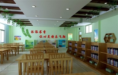 设计说明: 阅览室要展示读书对于人自身发展的重要性,倡导名人的奋斗进取精神,及其读书方法。阅览室是展示文化的窗口,环境文化设计简约自然,充满童趣,突出“沐浴书香,让心灵快乐飞翔”的文化主题,激励学生认识到“知识在于积累和运用”,启迪师生游其间,快乐读书,汲取思想智慧,才能阳光成长。